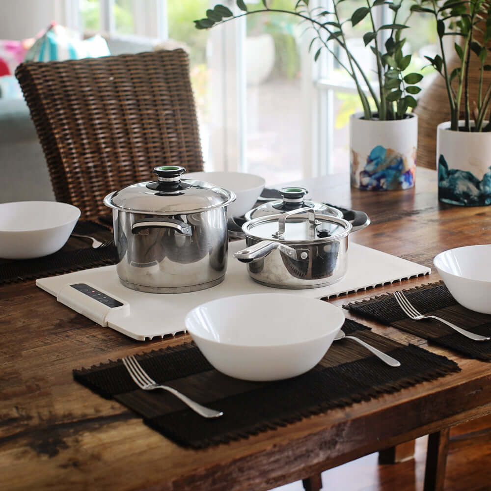 Einfach die Matte ausbreiten, anschließen und die gewünschte Temperatur einstellen. Stellen Sie Ihr Geschirr auf die Matte und genießen Sie warme Speisen.