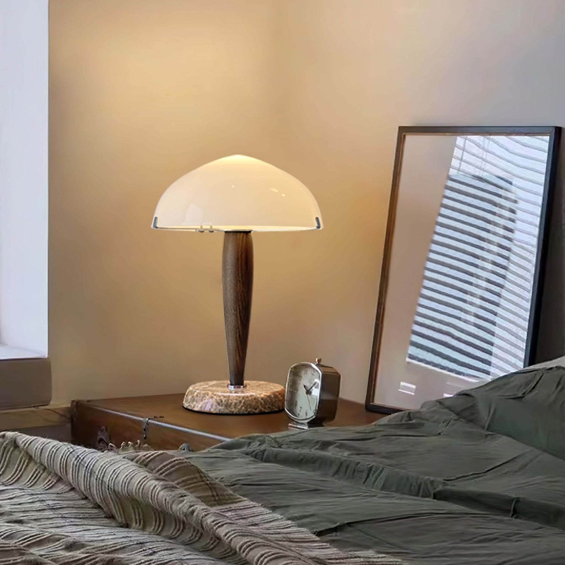 Hochwertige Materialien: Der Fuß aus massivem Walnuss und der Lampenschirm aus mundgeblasenem Glas zeugen von höchster Qualität und Langlebigkeit.