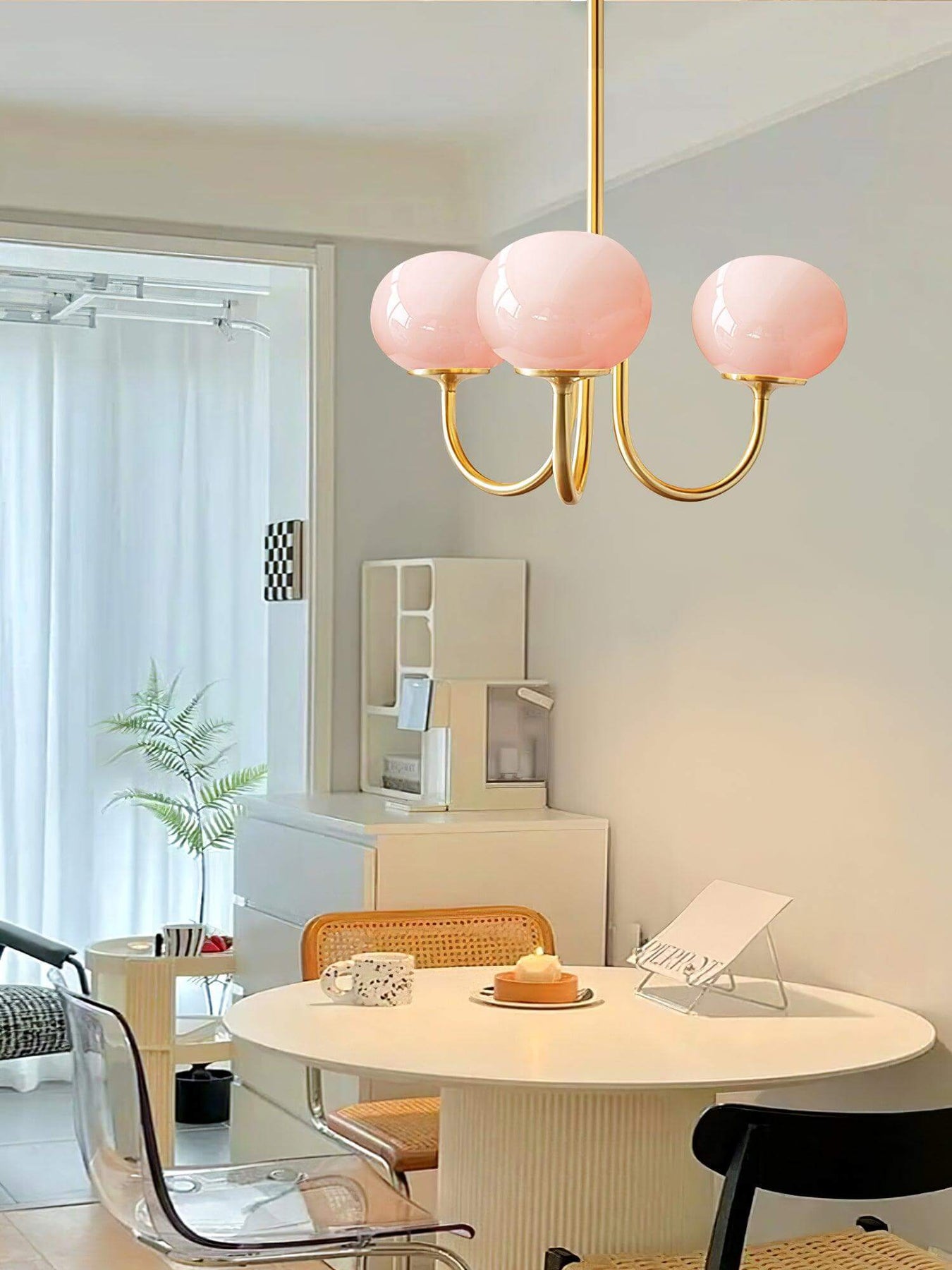 Einzigartiges Design: Das auffällige Design kombiniert goldene Elemente mit zartrosa Glasschirmen für einen Hauch von Glamour.