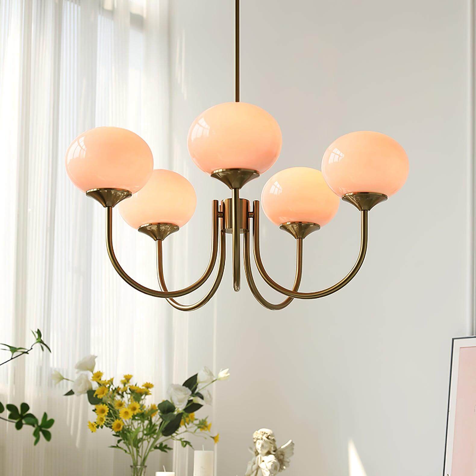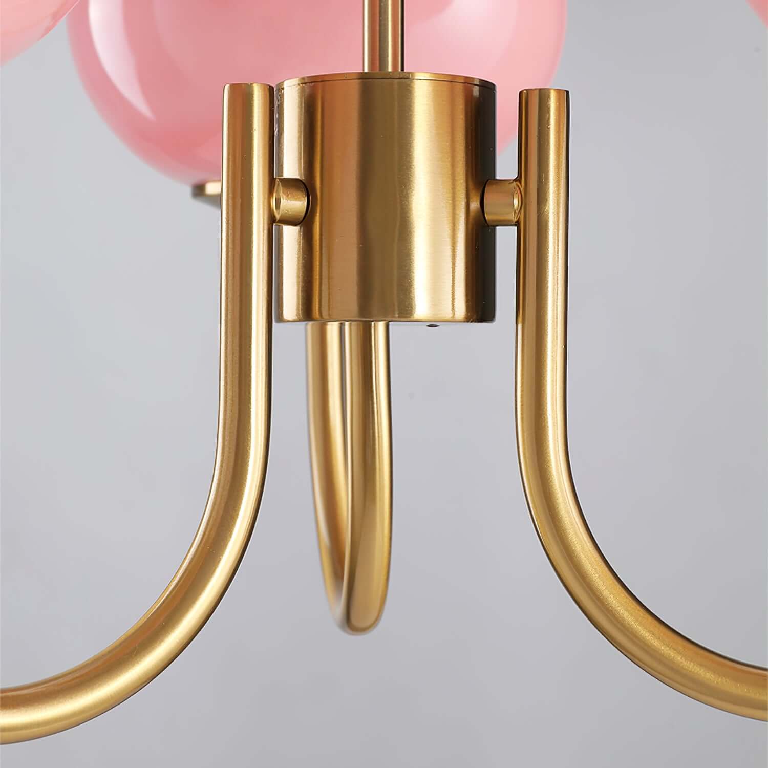 Verleihen Sie Ihrem Zuhause einen Hauch von modernem Glamour mit diesem stilvollen Kronleuchter. Das goldene Finish und die zartrosa Glasschirme verleihen jedem Raum einen Hauch von Eleganz und Raffinesse. Die perfekte Kombination aus moderner Farbgebung und verspieltem Design macht diesen Kronleuchter zu einem echten Blickfang.