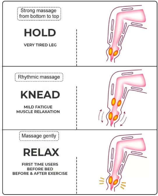 Lege die Beinmanschetten an und schließe sie mit den Klettverschlüssen. Wähle dein gewünschtes Massageprogramm und die Intensität. Optional kannst du die Wärmefunktion aktivieren. Nach 15 Minuten schaltet sich das Gerät automatisch ab.