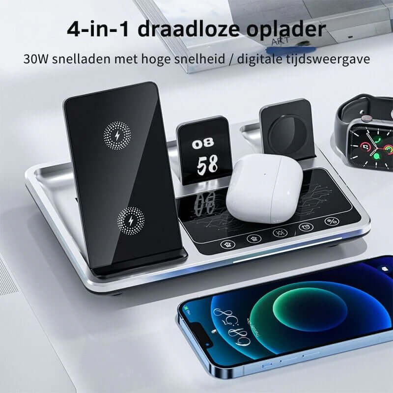 Diese Ladestation ist nicht nur funktional, sondern auch ein elegantes Accessoire. Sie passt perfekt auf Ihren Schreibtisch, Nachttisch oder in Ihr Wohnzimmer. Die integrierte LED-Anzeige hält Sie über Ladefortschritte und Uhrzeit auf dem Laufenden, während das rutschfeste Design für Sicherheit sorgt.
