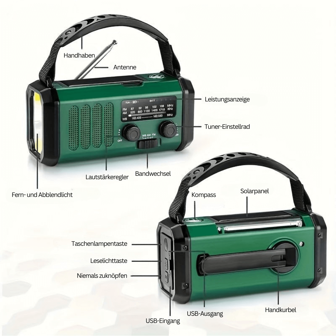 Stromausfall? Campingtrip? Mit diesem Notfallradio sind Sie für alles gewappnet. Es vereint Radio, Taschenlampe, Leselampe, SOS-Alarm, Kompass und Powerbank in einem kompakten Gerät. Ideal für Outdoor-Abenteuer, Notfälle oder einfach für zu Hause.