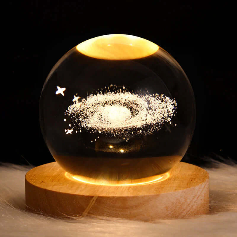 Das Herzstück dieser Lampe ist ein klarer, transparenter Kristall, der mittels eines speziellen 3D-Verfahrens bearbeitet wurde. Dadurch entsteht ein atemberaubendes, dreidimensionales Muster, das durch das Licht eindrucksvoll hervorgehoben wird. Das sanfte Leuchten schafft eine beruhigende und entspannende Stimmung.