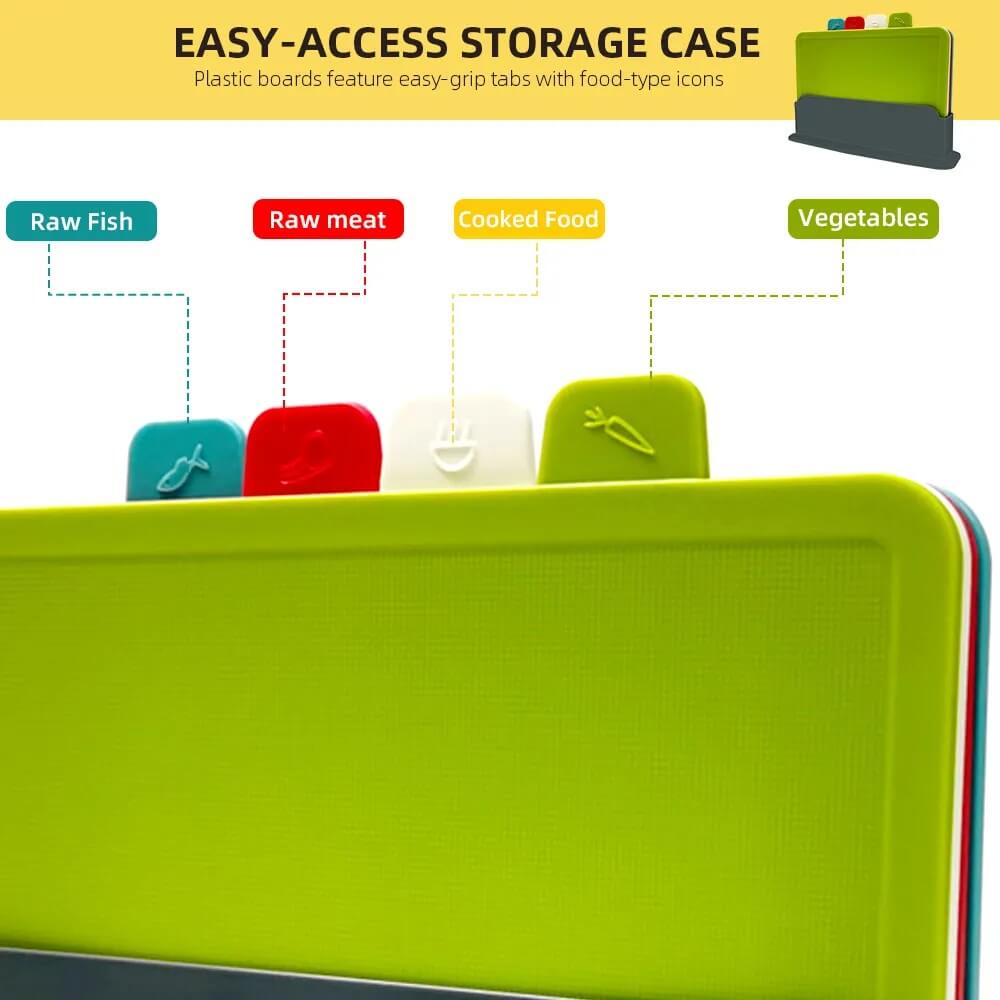 Vereinfachen Sie Ihre Küchenarbeit und verbessern Sie die Hygiene mit diesem 4-teiligen Schneidebrett-Set mit praktischem Halter. Farbcodierte Bretter und Lebensmittel-Icons helfen, Kreuzkontamination zu vermeiden. Ideal für alle, die Wert auf Sauberkeit und Ordnung legen.